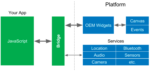 앱은 HTML을 만들어 플랫폼의 WebView에 표시한다. JavaScript와 같은 언어는 서비스와 같은 기본 코드와 직접 통신하기가 어렵기 때문에 JavaScript 영역과 기본 영역간에 컨텍스트 전환을 수행하는 "브리지"를 거치게된다. 플랫폼 서비스는 일반적으로 자주 호출되는 것은 아니기 때문에 성능 문제가 너무 많이 발생하지는 않았다.