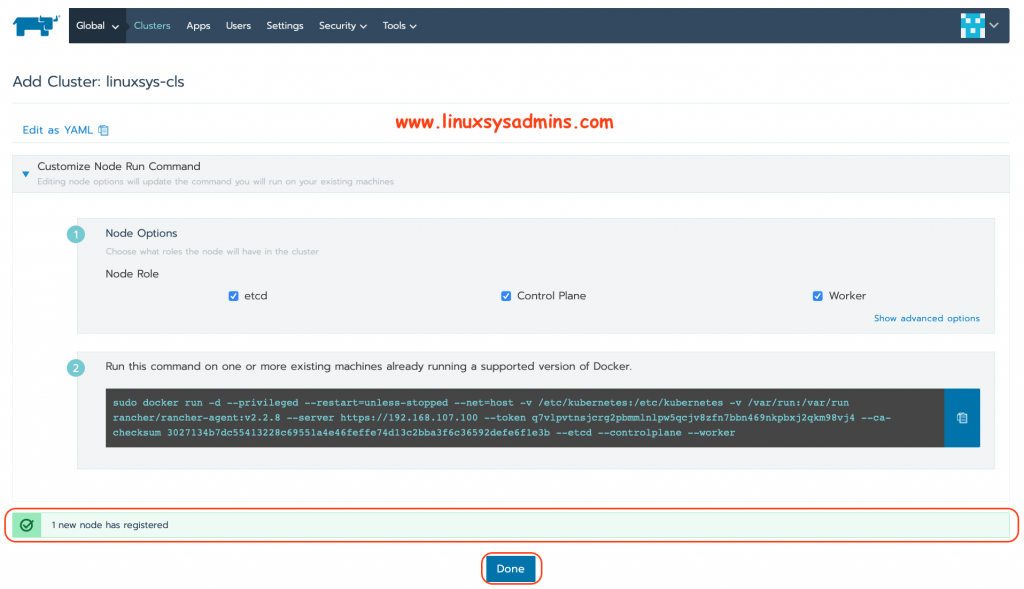 docker 명령이 완료되면“ 1 new node has registered ”가 표시됩니다. 확인되면 완료를 클릭하십시오.