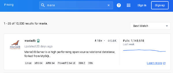 다음과 같이 docker.io 에 "mariadb"를 입력하면 자동으로 다운 로드 받습니다.