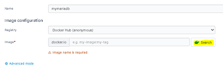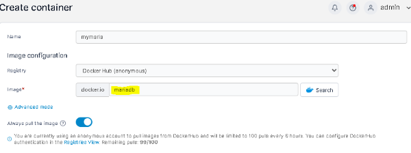 1) 컨테이너 이름으로 "mariadb" 라고 입력하고 image에 "mariadb/server" 라고 입력 하였습니다.