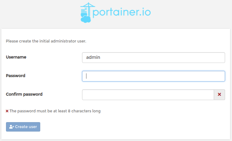 - 처음 접속하면 Portainer 초기 설정을 위한 페이지가 표시됩니다. 여기서 관리자 계정을 설정하고, Portainer가 관리할 Docker 환경을 선택합니다.