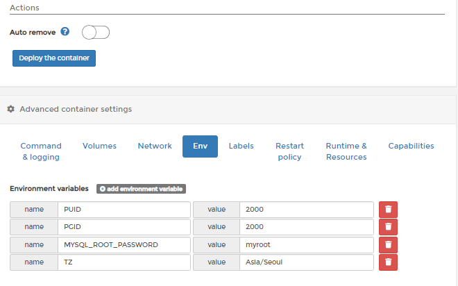 * PUID,PGID 와 같이 컨테이너의 권한을 2000으로 설정 하였습니다.