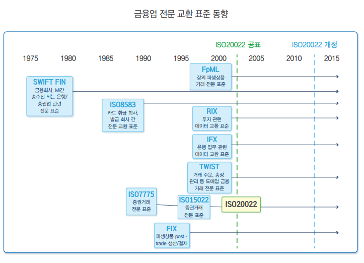 o 2000년대 중반까지 금융거래 전문 표준은 개별적(국가별, 산업별, 단체별) 규격으로 발전되어 왔으나, 국가 간/금융업 내 서로 다른 업종 간 거래가 증가함에 따라 금융회사 및 기관 간 전문 호환성 향상과 업무효율성 제고를 위해 공통의 표준을 필요로 하게 됨
