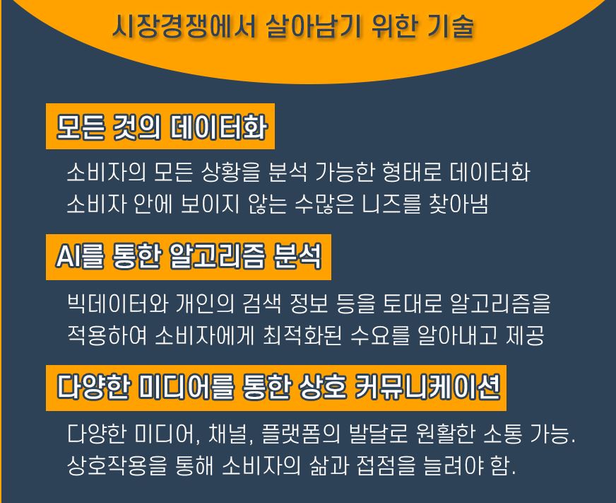 구글, 페이스북, 네이버, 카카오와 같은 거대 인터넷 기업의 성장 근간으로 광고를 기반으로 한다. 이러한 기업의 성장은 모바일의 보급과 관련이 깊다. PC를 이용하던 시대보다 고객의 행동은 짧은 사용 시간에도 빈번한 인터넷 접속을 한다는 것이다. 즉 광고의 노출이 예전보다 빈번해 졌다. 그리고 모바일 단말기는 항상 구글 또는 아이폰으로 로그인이 되어 있다. 모바일의 보급으로 고객의 활동정보는 고도화된 기술을 통해서 모든 행동과 관심을 수집 할 수 있는 세상이되었다. 이와 같은 빅테크 기업들은 DMP (Data Management Platform), RTB(실시간 광고 처리)를 통해서 실시간으로 정교한 고객 세그먼트에 대한 타겟팅이 가능해 졌고, 실시간 고객의 반응에 따라 적합한 광고 컨텐츠를 전달할 수 있게 되었다.