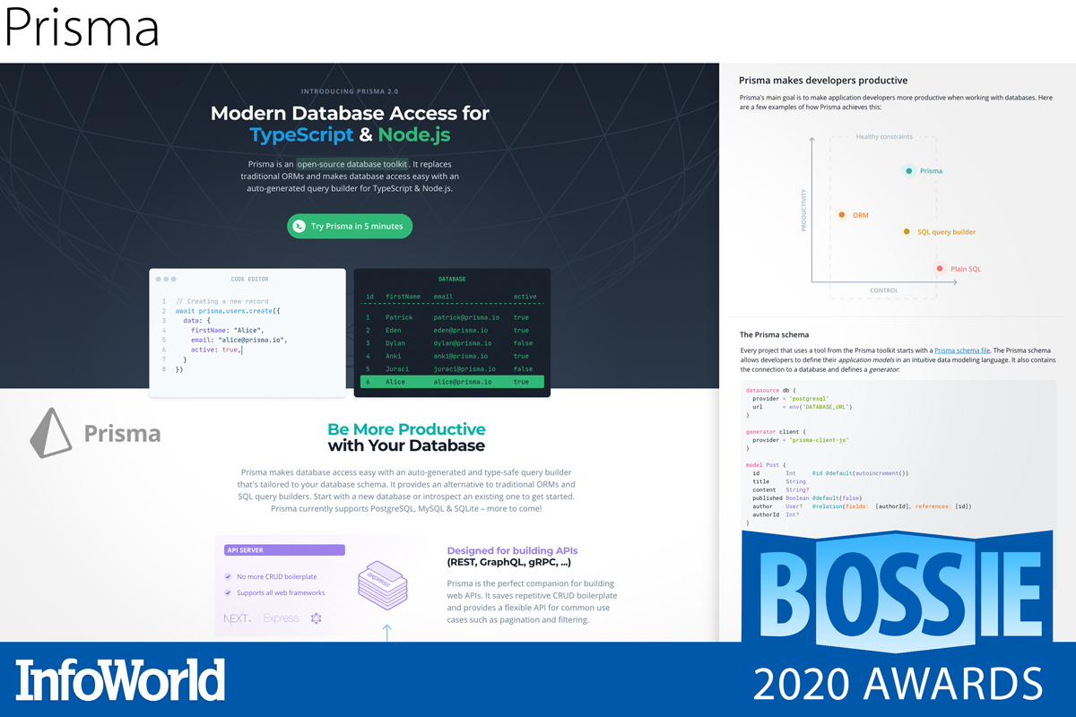 Prisma는 gRPC 및 GraphQL을 포함한 API 개발을 염두에두고 설계하였다. PostgreSQL, MySQL 및 SQLite 데이터베이스에서 작동된다. Visual Studio Code 확장과 최신 데이터베이스 API 및 매핑 솔루션에서 기대할 수있는 모든 것이 포함되어 있다. 객체와 쿼리의 관점에서 생각하고 안전한 형식과 자동으로 고형식 안전성과 모든 수정 사항을 갖고 싶은 개발자는 Prisma를 고려할 수 있다.
