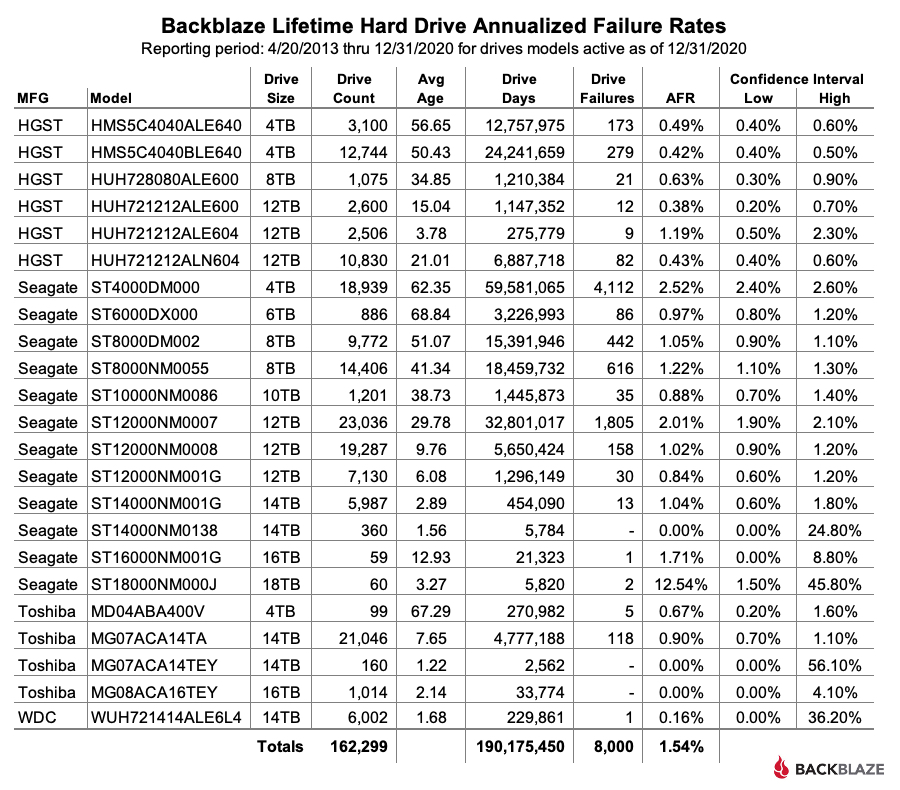 2020 년 말에 Backblaze는 데이터 저장에 사용되는 162,530 개의 하드 드라이브를 모니터링하여 하드 드라이브의 오류율을 조사 하였습니다.