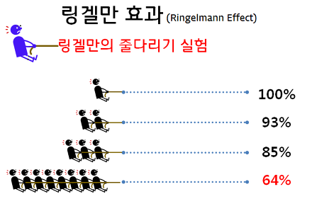 집단 속에 참여하는 개인의 수가 늘어갈수록 성과에 대한 1인당 공헌도가 오히려 떨어지는 현상을 말한다. 독일 심리학자 링겔만은 줄다리기를 통해 집단에 속한 각 개인들의 공헌도의 변화를 측정하는 실험을 통해 개인이 당길 수 있는 힘의 크기를 100으로 보았을 때, 2명, 3명, 8명으로 이루어진 각 그룹은 200, 300, 800의 힘이 발휘될 수 있을 것으로 기대되었다.