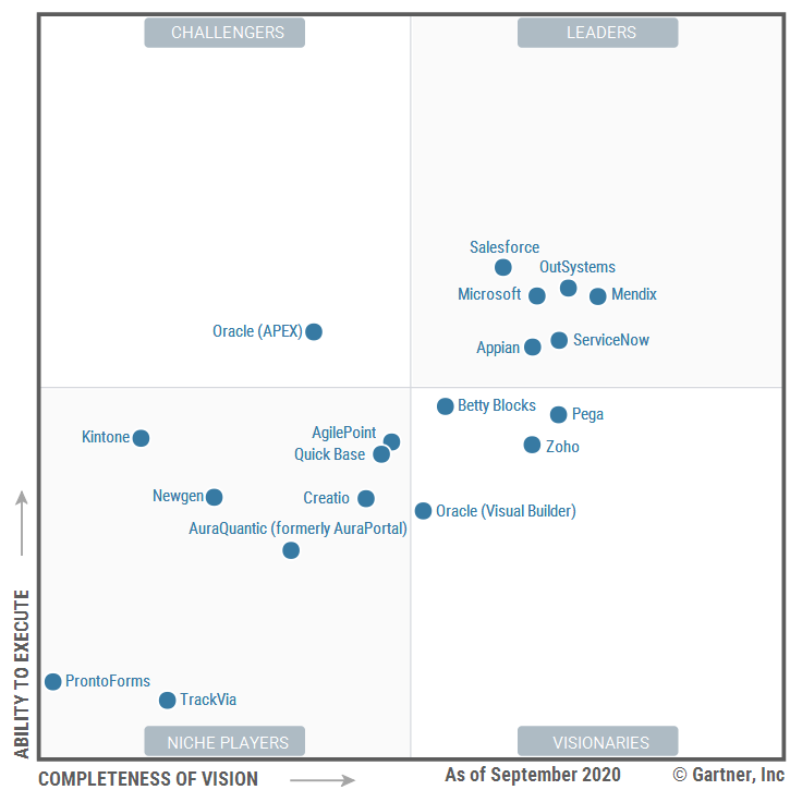 아래는 가트너에서 Low-Code Application Platforms (LCAP) 공급 업체들을 비교 평가한 자료입니다.