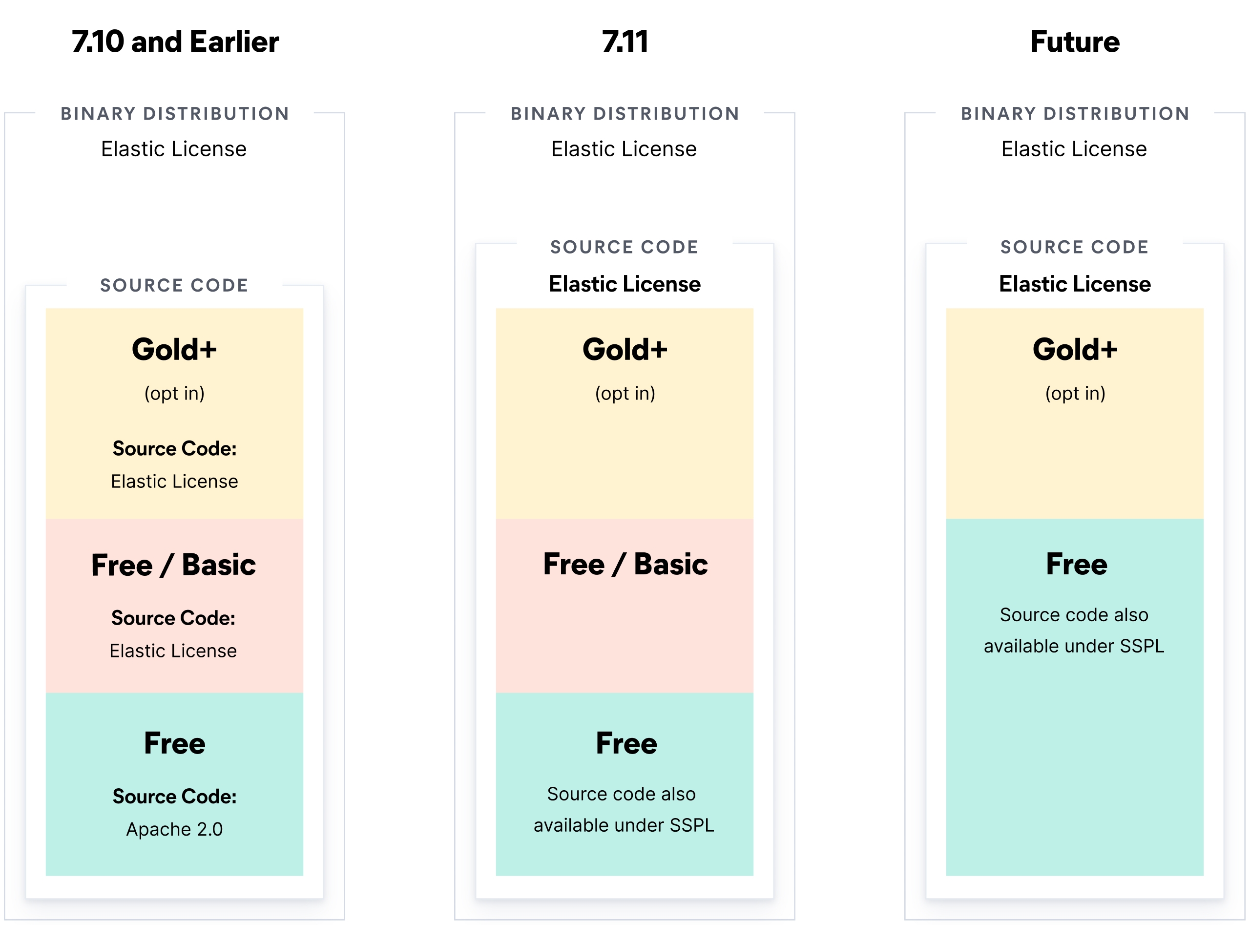 Elasticsearch와 Kibana를 서비스로 제공하는 것을 제한하여 우리가 무료 개방형으로 배포하는 제품 개발에 대한 지속적인 투자를 보호합니다. 이는 7.11 릴리즈부터 이 두 제품의 모든 유지관리 분기에 적용됩니다. Elastic의 기본 배포판은 계속 Elastic License를 따르게 됩니다.
