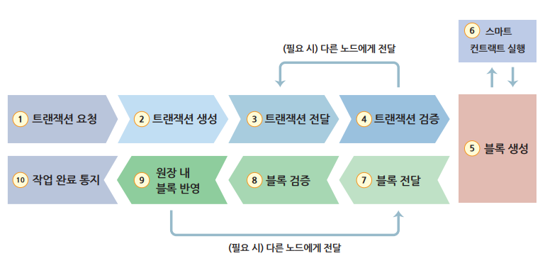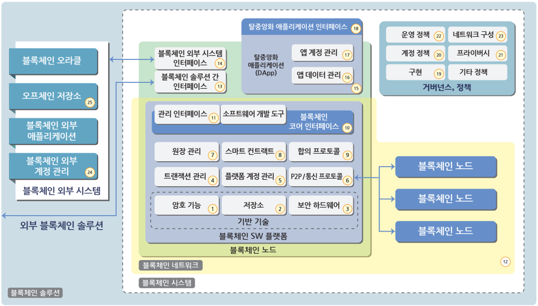 - 프로세스 (암호 기능, 트랜잭션 관리, 스마트 컨트랙트, 탈중앙화 애플리케이션 등),