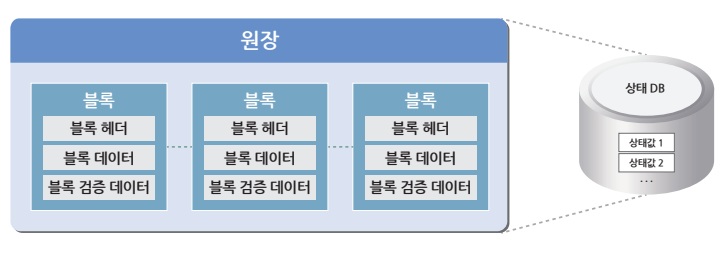 원장에는 거래가 단순 나열된 형태로 기록되기 때문에 블럭의 내용을 쉽게 찾기 위해 별도의 상태 DB를 관리한다.