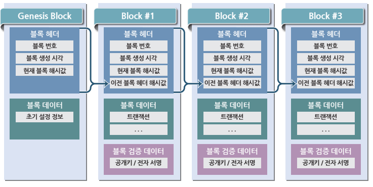 블록은 일반적으로 블록 헤더, 블록 데이터, 블록 검증 데이터로 구성된다