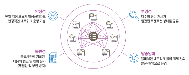 또 분산된 네트워크를 기반으로 단일 지점의 오류가 발생하더라도 안정성을 보장한다. 이러한 블록체인의 특징으로 정보의 보관과 유통을 안전하게 제공하는 신뢰성을 제공한다.
