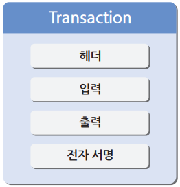 헤더에는 트랜잭션 관련 정보들이 기록되고, 스마트 컨트랙트의 실행 결과 등을 포함한 트랜잭션 처리 데이터는 입력ㆍ출력에 포함되며, 트랜잭션 생성 개체의 전자 서명이 첨부된다.