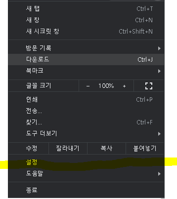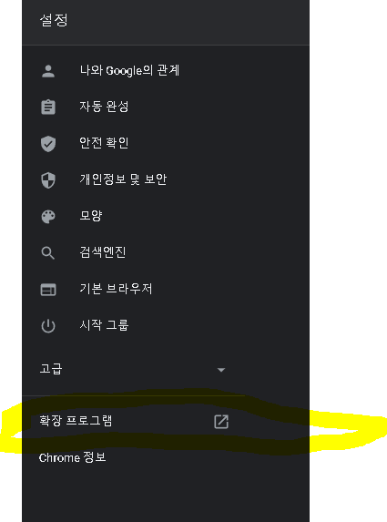 설정 메뉴 중에서 확장 프로그램을 클릭합니다.