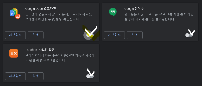 아래와 같이 체크된 부분을 클릭하면 확장 프로그램이 백그라운드로 실행 되지 않도록 해주시면 됩니다.