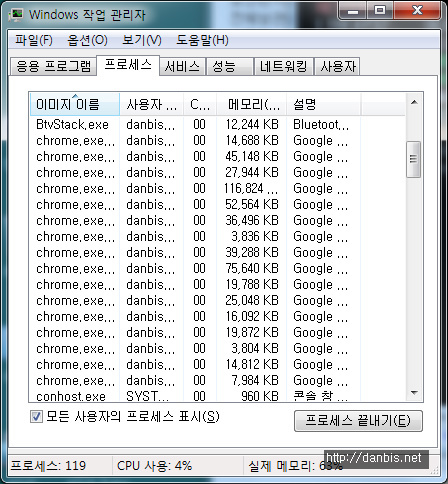 크롬 브라우저 는 TAB마다 프로세스가 생기고 별도의 예비프로세스도 있어서 작업 관리자에는 크롬 프로세스가 생각보다 많이 보입니다.