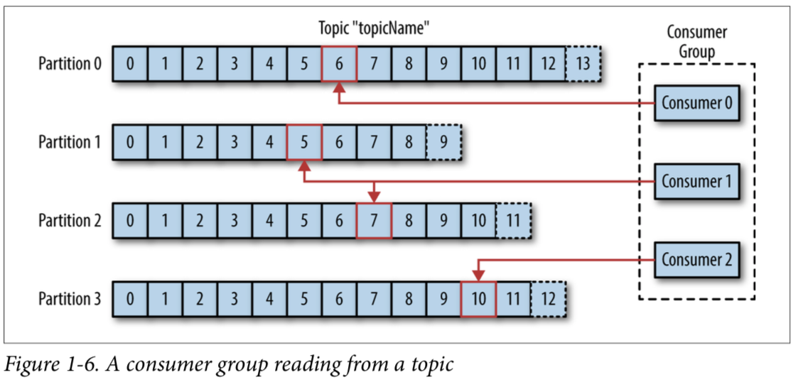 아래와 같이 카프카는 소비자 그룹과 파티션의 관계에서 1:N의 관계를 형성한다. 단 하나의 토픽에 여러개의 컨슈머 그룹을 연결하기도 한다. 소비 그룹은 소비자를 하나의 범주로 분류하는 논리적 개념이며 각 소비자는 하나의 소비 그룹에만 소속한다. 각 소비 그룹에는 고정된 이름이 있다. 소비하기 전에 소비자는 자신이 속한 소비 그룹의 이름을 지정해야 합니다. 이는 소비자 클라이언트 매개변수 group.id를 통해 수행 할 수 있다.