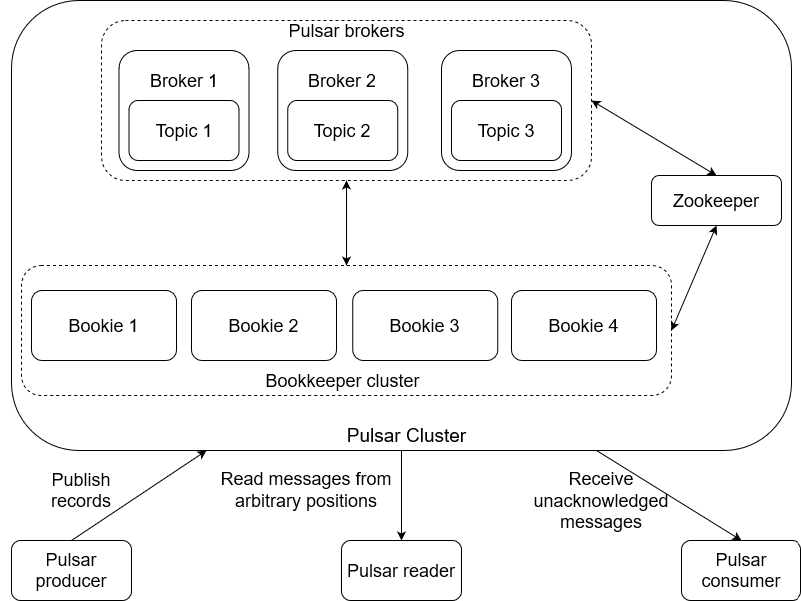 - Zookeeper: Pulsar는 Zookeeper를 사용하여 클러스터에서 브로커와 BookKeeper 노드(일반적으로 Bookies라고 함)의 모든 메타데이터를 관리합니다.
