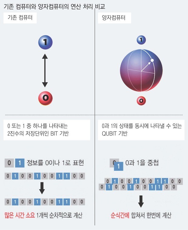 디지털 컴퓨터의 정보 저장 기본 단위는 ‘비트(bit)’다. 양자컴퓨터에서는 이 기본 단위를 ‘큐비트(qubit)’라 부른다. 큐비트의 개수는 양자컴퓨터의 성능을 좌우한다. 이론적으로 큐비트가 하나 늘어날 때마다 계산 능력이 두 배가 된다. 별것 아닌 듯하지만, 이게 엄청난 차이를 만든다. 큐비트 10개면 약 1000배, 20개면 100만 배, 40개면 1조 배가 된다.
