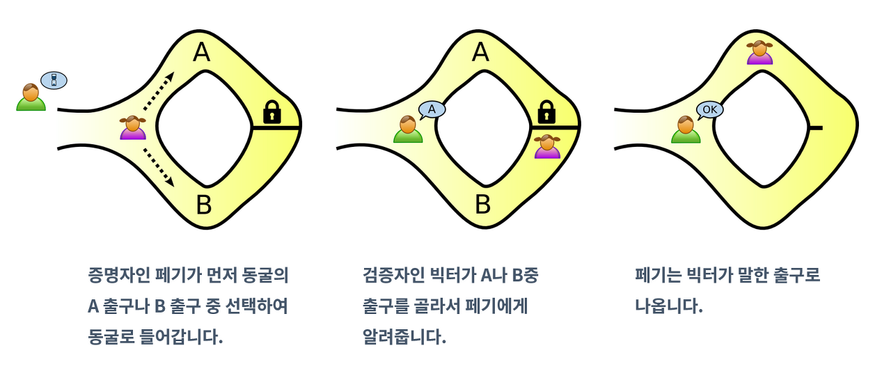 찰리(Charlie)는 증명자(prover)이고 스미스(Smith)는 검증자(verifier)라고 가정하자. 찰리와 스미스 모두 비밀문이 있는 동굴 가까이에 왔습니다. 둥근 고리 형태의 동굴에는 A와 B라는 길이 있으며 그 사이에는 도어락이 설치된 비밀문이 있습니다. 찰리는 스미스에게 비밀문의 암호를 알고 있다고 말합니다. 하지만 찰리는 스미스를 포함한 다른 누구에게도 그 암호를 밝히고 싶지 않습니다. 이에 대해 스미스는 믿을 수 없다며 찰리에게 암호를 알고 있음을 증명하라고 합니다. 즉, 검증자는 증명자에게 직접적으로 설치된 도어락의 비밀번호를 물어보지 않고 증명자가 비밀번호를 알고 있다는 명제가 참인지 확인하려 합니다.