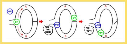 2. 검증자는 A와 B의 갈림길에 서서 증명자에게 특정 길로 나오라고 지시한다.