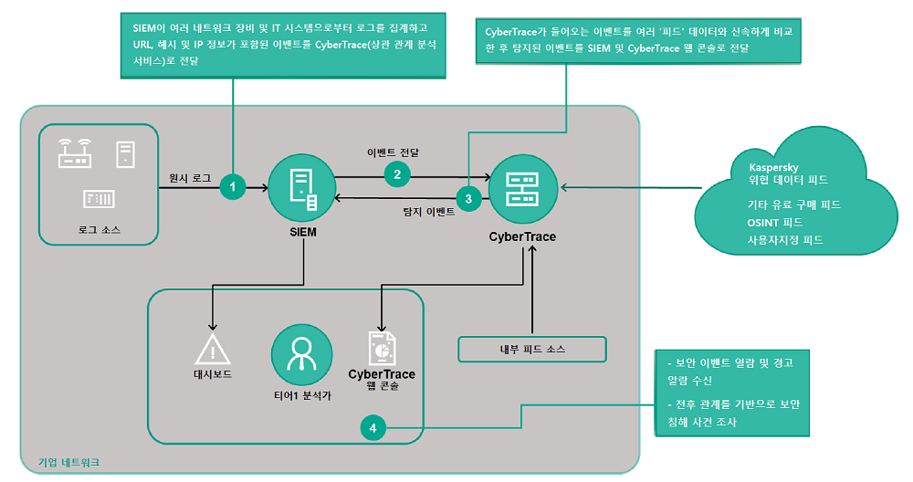 ‘카스퍼스키 사이버트레이스’는 ▲IBM 큐레이더(QRadar) ▲스플렁크(Splunk) ▲아크사이트(ArcSight) ESM ▲로그리듬(LogRhythm) ▲RSA 넷위트니스(NetWitness) ▲맥아피(McAfee) ESM 등의 다양한 SIEM 솔루션은 물론, 방화벽 및 게이트웨이와 같은 기타 보안 제품과도 원활하게 통합