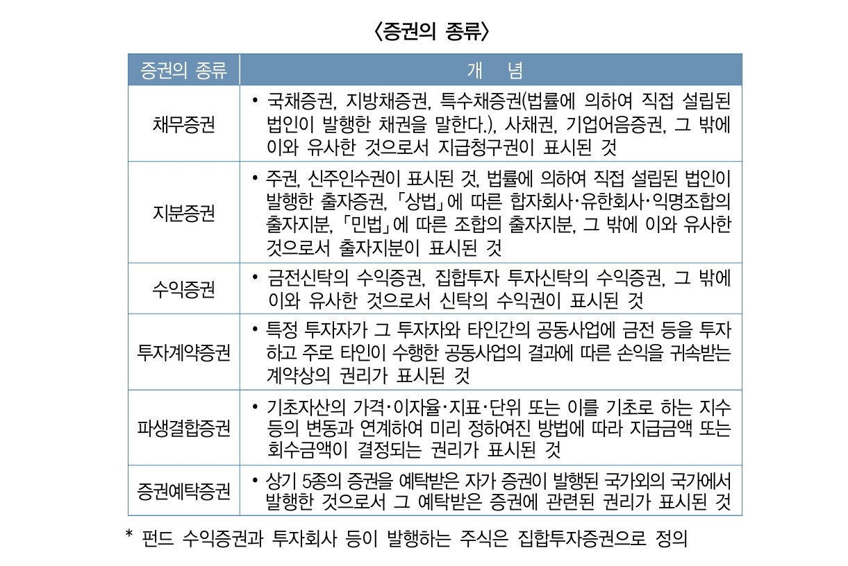 증권은 주식, 채권 등과 같은 전통적 유가증권 뿐 아니라 지급청구권, 지분권, 수익권 등 권리가 표시된 것으로서 현재 존재하고 있는 것 뿐 아니라 앞으로 출현할 다양한 종류의 새로운 증권을 모두 포함합니다.
