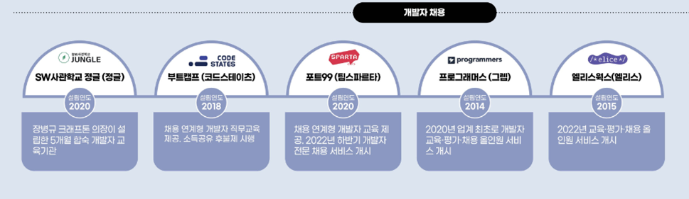 - 컴퓨터 프로그래밍 교육 플랫폼으로 소프트웨어 개발자 직군의 취업 준비생, 이직자 풀을 스타트업에 연결