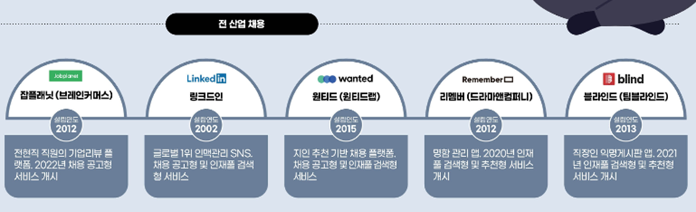 기존 잡보드 채용공고형 회사(잡코리아, 사람인)와 잡플래닛(기업 연봉·복지 비교), 블라인드(직장인 익명 게시판), 리멤버(명함 관리) 등이 인력 중개 플랫폼 시장에 진출