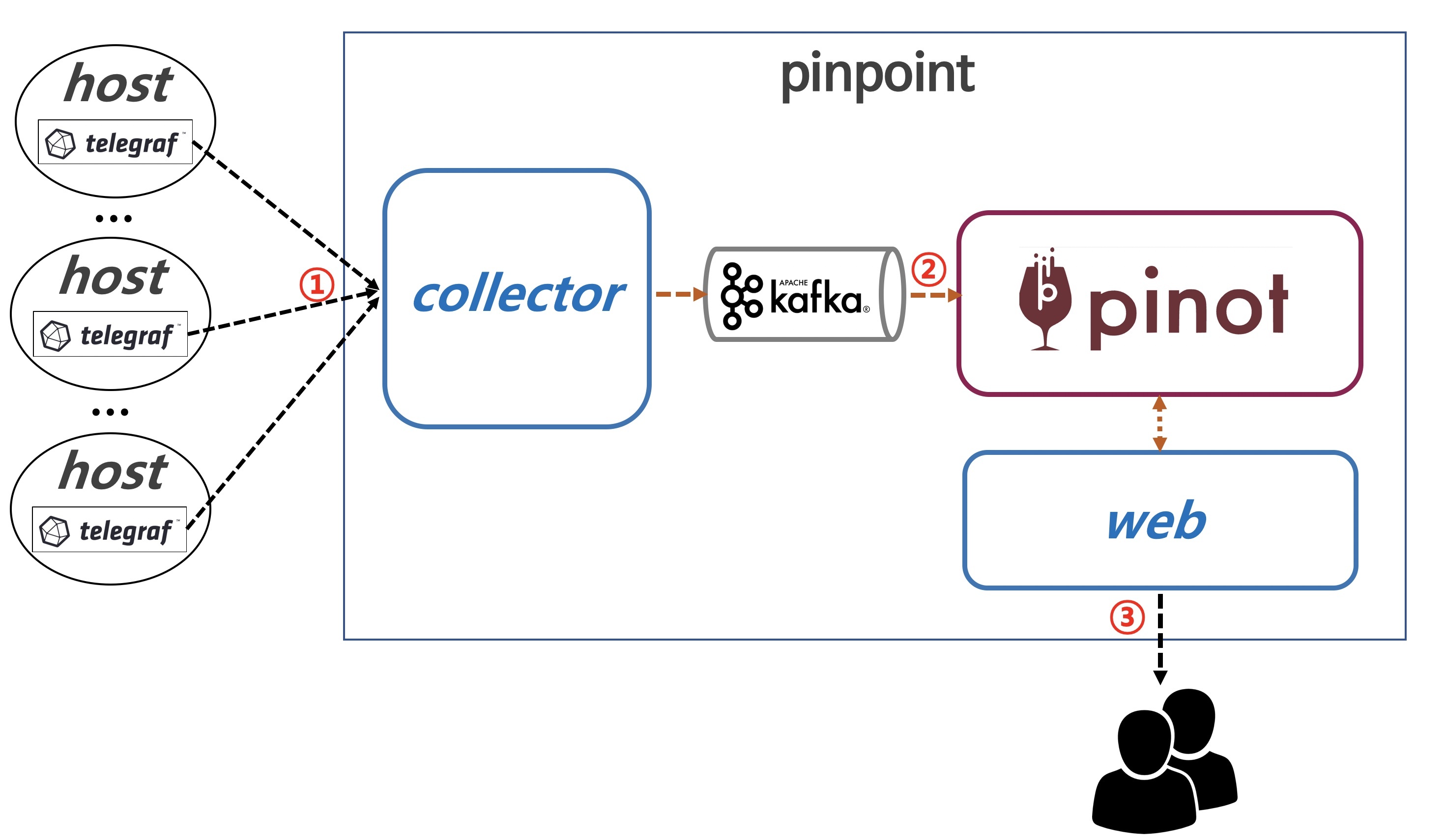 ② collector는 kafka에 데이터를 전송하여 pinot에 데이터를 저장한다.