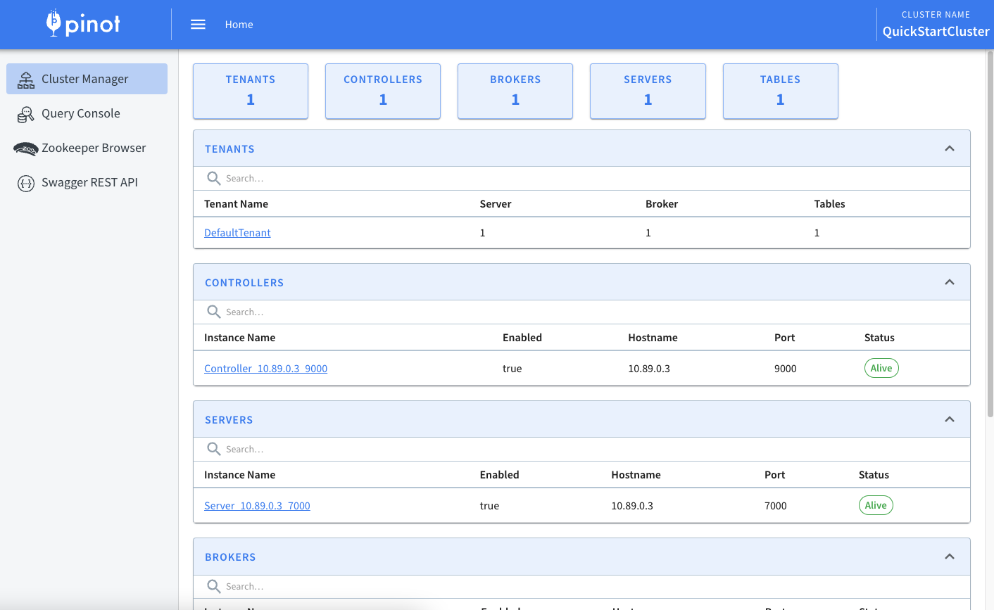 아래와 같이 브라우저에서 http://localhost:9000에서 Pinot 웹 인터페이스 화면을 볼 수 있습니다.