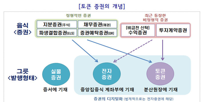 토큰증권이라는 새로운 발행 형태를 만들어 전통적인 지분·채무증권(주식·채권) 등은 물론 최근 등장한 비정형적 증권(수익증권·투자계약증권)들까지 제도권으로 포섭한다는 점이다.