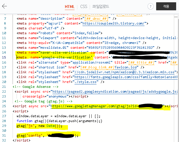 5. 블로그 관리자 스킨편집 - 복사한 HTML태그 저장
