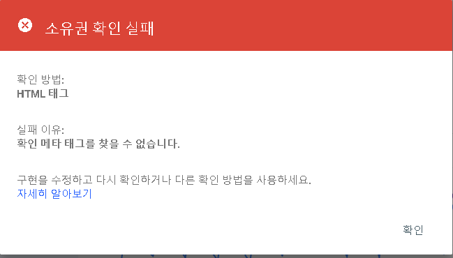 소유권 확인 실패는 Meta를 등록하지 않았으므로 블로그에 맞게 처음부터 진행하면 됩니다.