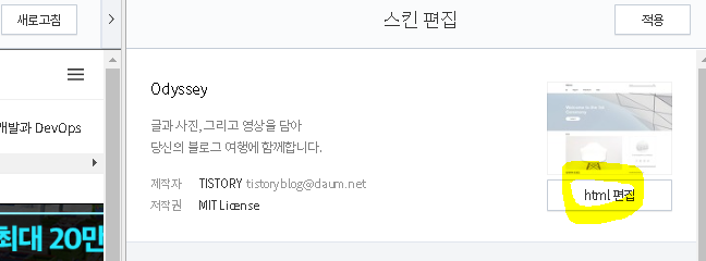 스킨편집화면에서 HTML 편집을 진행합니다.
