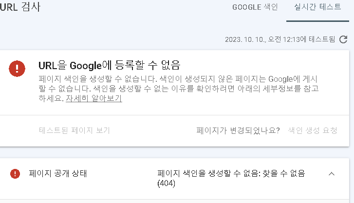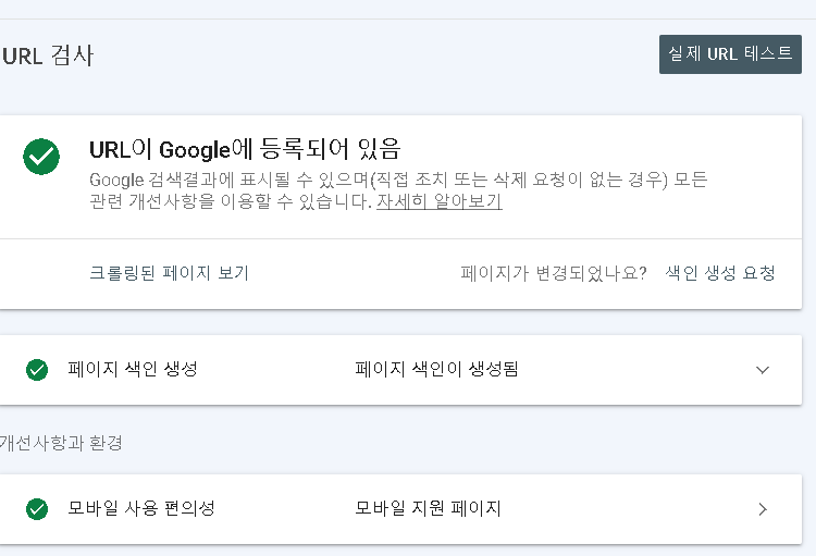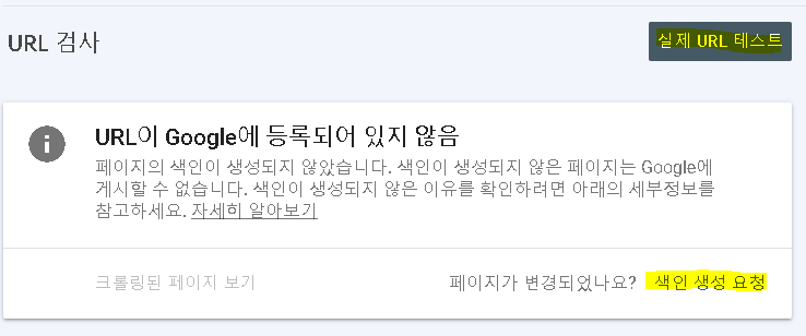 이때 "실제 URL테스트" 를 누르고 검사가 되고 나면 다시 "색인 생성 요청"을 하는 것이 좋을 것 같습니다.