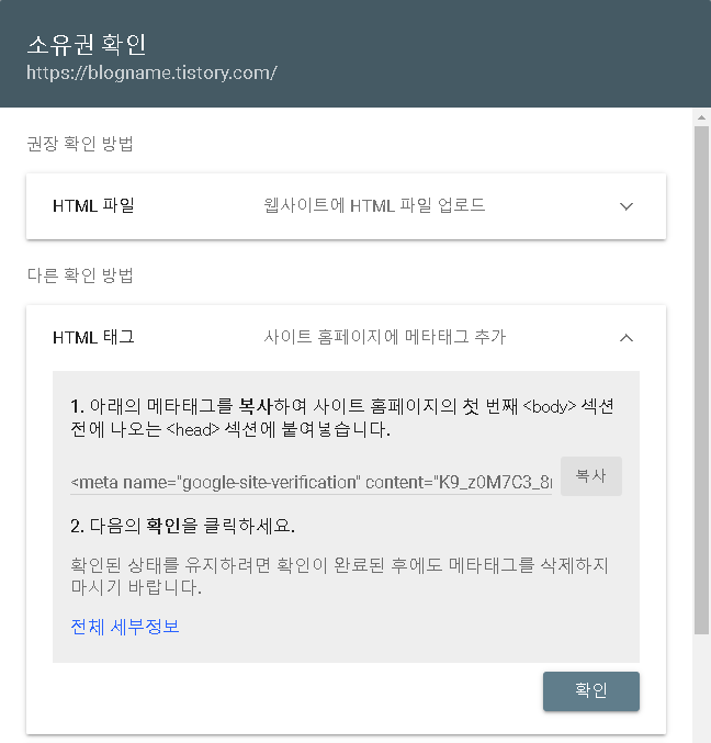 소유권 확인 방법은 다양한 것들이 있지만 자신이 직접 만든 블로그 사이트가 아니므로 해당되지 않습니다.