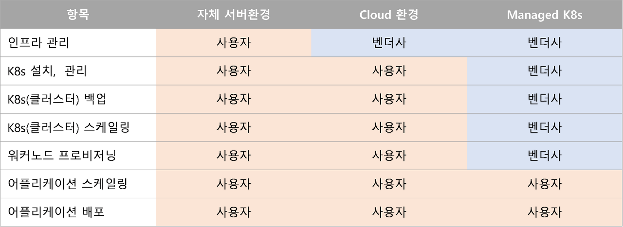 | 클라우드 플랫폼에 관리형 구축 (Managed) | 설치를 할 필요가 없으며, 인프라와 쿠버네티스를 CSP에서 관리하는 서비스 이용 쉽게 사용이 가능하고, 각 클라우드 플랫폼의 종속적인 자체 기능도 활용 가능 |