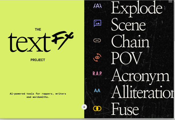 TextFX는 Google의 PaLM 2 대규모 언어 모델을 사용하는 10가지 AI실험 도구를 제공 합니다. 텍스트와 언어로 창의적인 가능성을 창출하여 글쓰기 과정을 확장하도록 설계되었습니다.