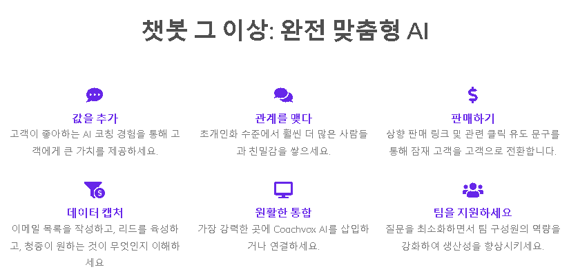 콘텐츠와 스타일에 맞춰 훈련된 AI로 콘텐츠와 코칭 스타일을 사용하여 고객에게 가장 적합한 서비스를 제공하는 방법을 리딩하거나 상담하도록 합니다.