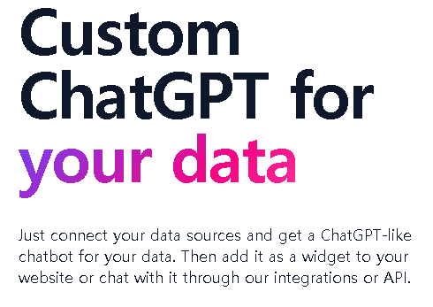 chatGPT와 데이터 소스를 연결하고 데이터에 대한 챗봇을 웹사이트에 위젯으로 추가하거나 통합 또는 API를 통해 채팅 합니다.