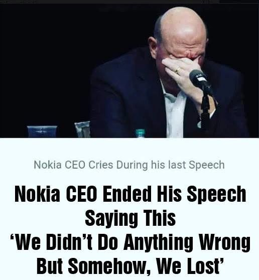 (2) “we didn’t do anything wrong, but somehow, we lost”: Nokia CEO. https://medium.com/@akiraaps/we-didn-t-do-anything-wrong-but-somehow-we-lost-nokia-ceo-502f4e6e7574.