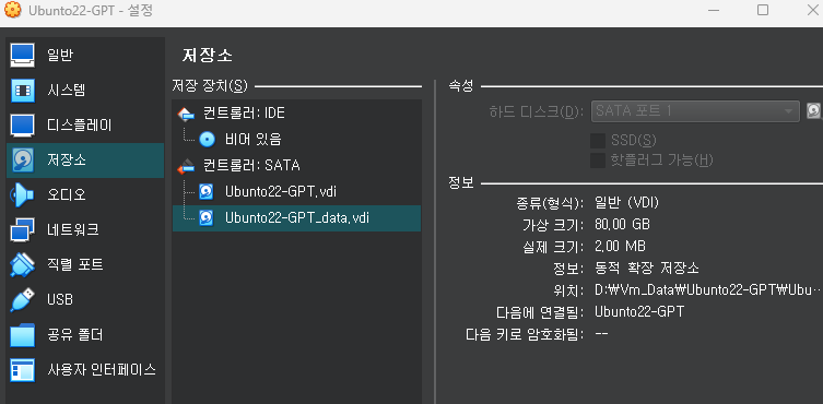 위와 같이 저장소의 Ubunto22-GPT_data.vdi로 80G정도 용량으로 저장을 하였습니다.