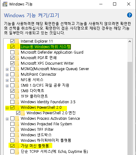 1) Windows 기능 켜기/끄기 열기: