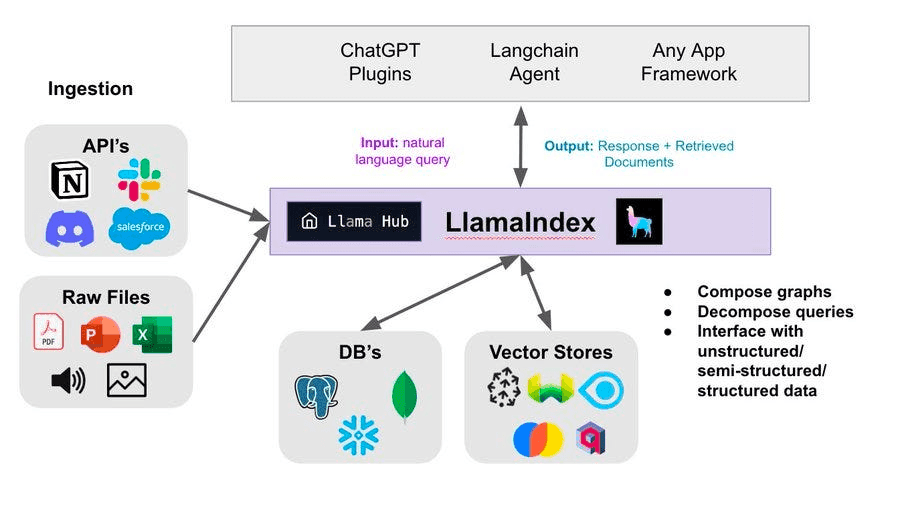 LlamaIndex는 개인 데이터를 가져 오고 구조화하는 도구를 제공하며 데이터에 대한 고급 검색 / 쿼리 인터페이스를 생성하고 외부 응용 프레임 워크와 쉽게 통합 할 수 있도록 지원하여 ChatGPT와 함께 작동합니다.