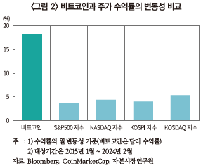 비트코인 가격의 변동성은 주식 등 전통적 금융자산에 비해 매우 커서(S&P500의 약 5배, KOSPI의 약 4.5배) 상당한 가격 위험이 관측 됩니다.