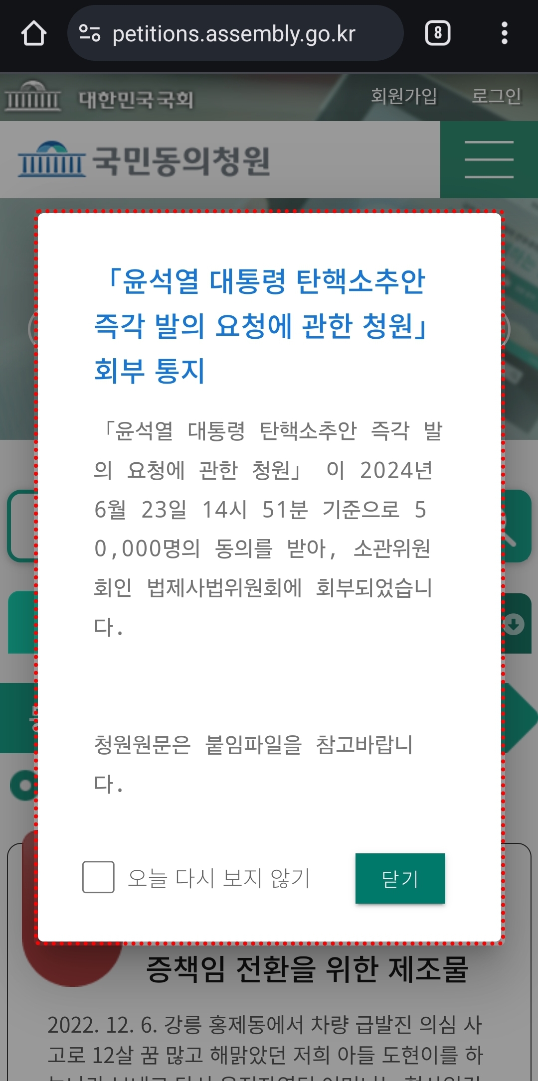 2024년 6월 23일 국민동의국회청원으로 윤대통령의 탄핵 청원에서 20만명의 동의를 거쳐 국회 법제사법위원회에 회부 되었다는 소식입니다.