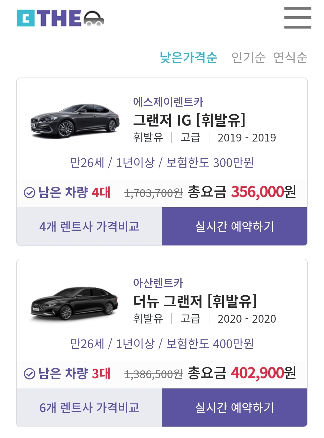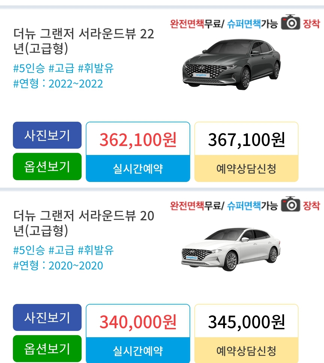 제주도에서 8월 15일 10시부터 8월 19일 13시까지 렌터카 그렌저를 대여하는 가격을 비교해 보았습니다. 여러 렌터카 업체들의 가격 정보를 바탕으로 비교하였으니 참고하시기 바랍니다.