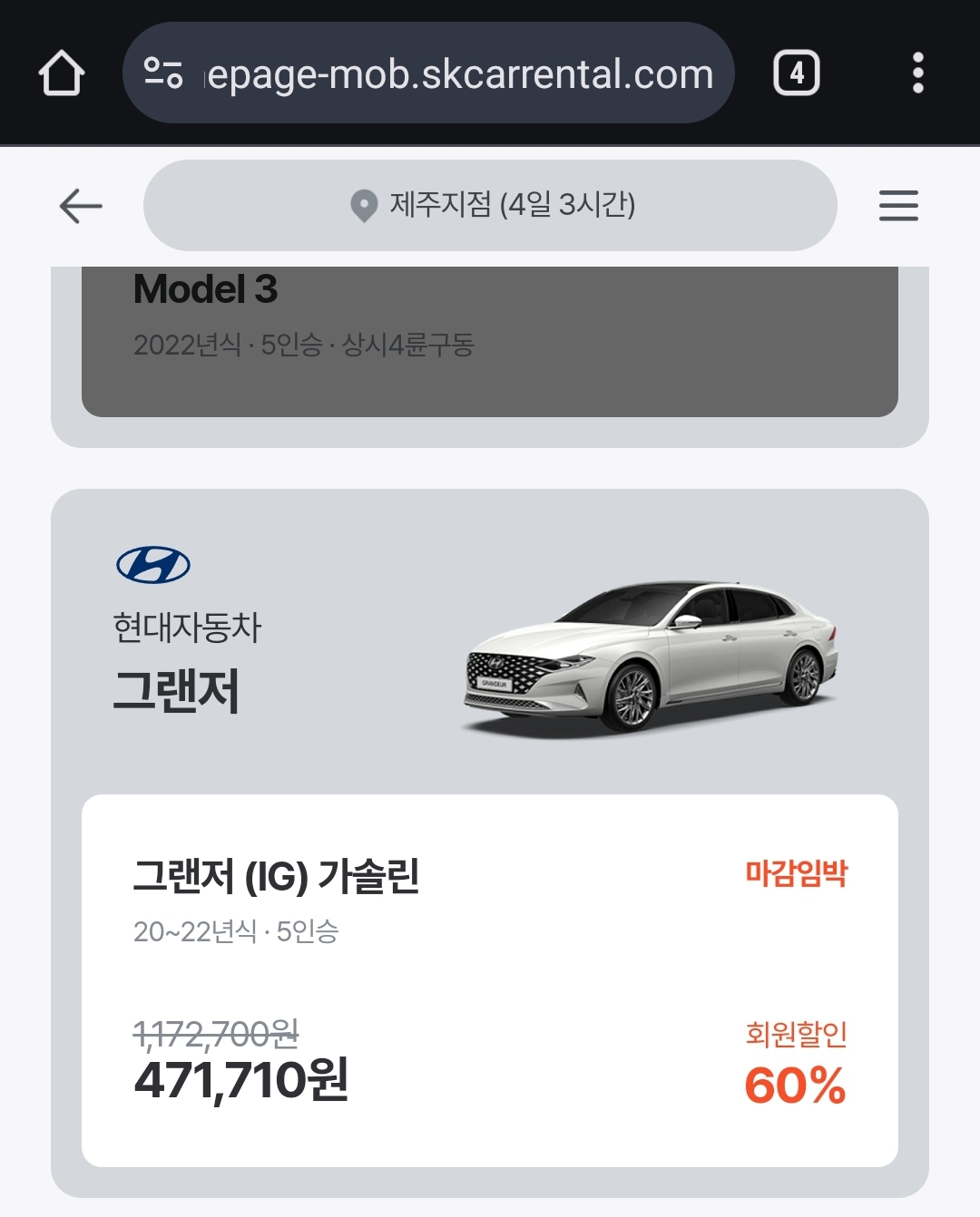 제주도 8월 15일 10시부터 8월 19일 13시까지 렌터카 그렌저 가격 비교